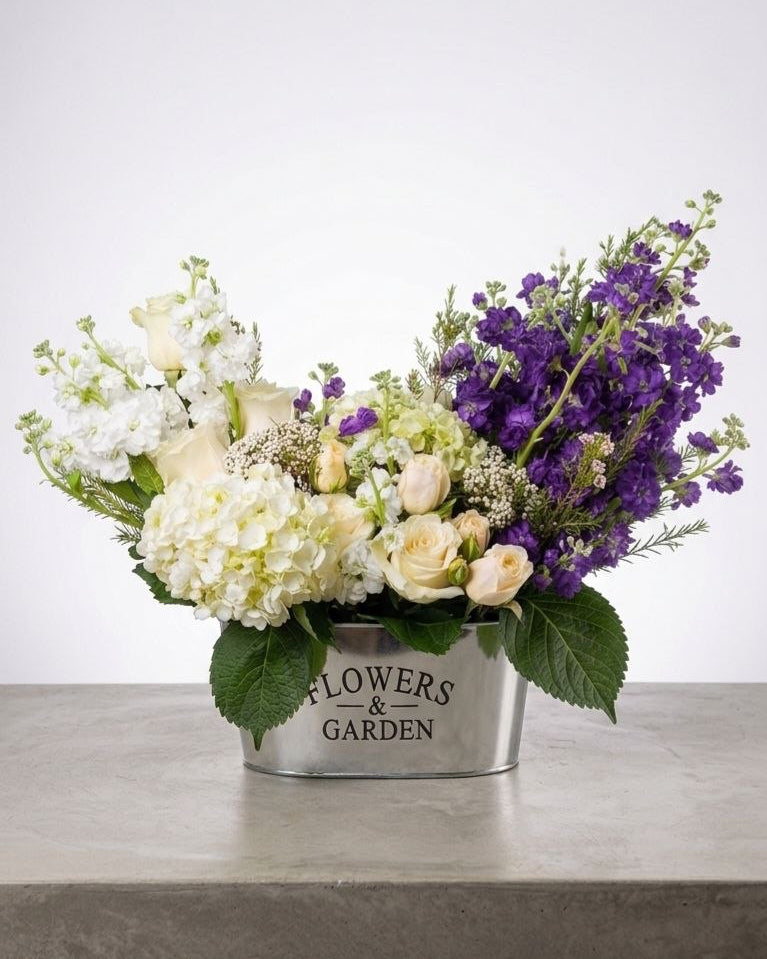 Bring the charm of a blooming meadow indoors with this lush, asymmetrical floral arrangement. Nestled in a rustic "Flowers & Garden" galvanized metal tin, this bouquet features a striking contrast of crisp whites and deep, royal purples.