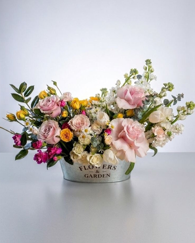 Add a touch of whimsical charm to any space with this stunning assortment of garden-fresh blooms. This delightful arrangement, presented in a rustic yet elegant galvanized metal planter embossed with "FLOWERS & GARDEN," is bursting with color and texture. Features velvety pink roses, vibrant yellow spray roses, creamy ranunculus, and delicate white stocks, all accented with lush eucalyptus and verdant foliage. Perfect for a thoughtful gift or a beautiful centerpiece, this arrangement is sure to impress. Order today and let the beauty of Standard Blooms brighten your day!